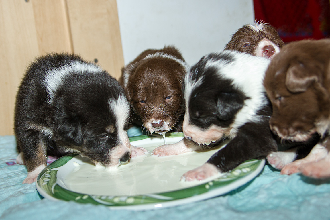 Die kleine Rasselbande wird von Tag zu Tag munterer. Sie versuchen mittlerweile miteinander oder mit Mama Cho zu spielen. Die kleinen Zähnchen wachsen auch schon fleißig. Dies scheint Cho auch zu spüren. Dennoch kümmert sie sich weiterhin sehr liebevoll um ihre Kleinen, nimmt sich mittlerweile jedoch ein wenig mehr "Auszeiten" für sich. Gestern Nachmittag/Abend haben wir unseren A´s das erste Mal Welpenmilch angeboten. Ein schöner Spaß für die ganze Bande. Das meiste der Milch ist vermutlich auf dem Boden gelandet oder war im Fell der Kleinen. Jeder musste mindestens einmal am besten quer über den Teller laufen. Dennoch scheint es ihnen zu schmecken und die Milch wurde sehr gut angenommen. Bilder von dem Abenteuer (und natürlich auch weitere aus den letzten Tagen) gibt es in der Bildergalerie auf der Seite unserer A´s!!! |