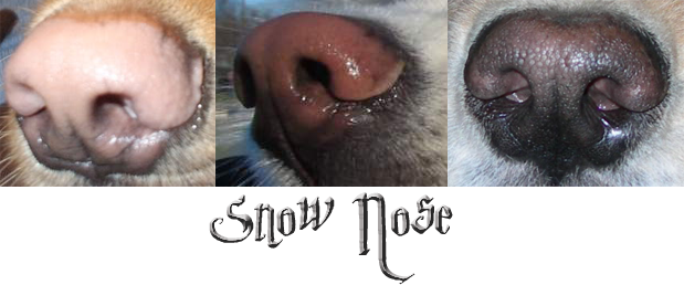 Hunde in ee-red haben jedoch gerne schon mal eine sogenannte "Snow-Nose" oder auch "Wechselnase". Dabei kommt es zu einem Pigmentverlust in der Nase. Wodurch die Nase, meist mittig, oft rosafarben bis bräunlich aussieht. Im Randbereich der Nase bleibt die eigentliche Pigmentierung erhalten. Der Begriff "Snow-Nose" kommt daher das dieser Pigmentverlust in den Wintermonaten deutlicher ist als in den Sommermonaten.