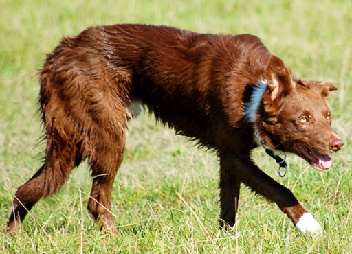 reinerbig rezessiver aufgehellter Hund. Die Grundfarbe wird somit von braun zu lilac aufgehellt. Gencode: E-/bb/KB/dd/egal welcher A-Locus/mm