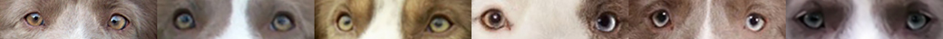 | Verschiedene Augenfarben bei aufgehellter brauner Pigmentierung. Bei aufgehellt braunen Hunden sind die Augen oft eher geblich bis grün. |