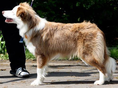 Ein reinerbig zobelfarbener Border Collie (Clear-Sable) bei aufgehelltem braunen Pigment Gencode: bb/kyky/dd/AYAY/mm/E- Offizielle Bezeichnung: Lilac Zobel-Weiß / Lilac Sable-White |