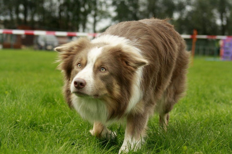 Ein Brindle Border Collie (Clear-Sable) bei aufgehelltem braunen Pigment Gencode: |