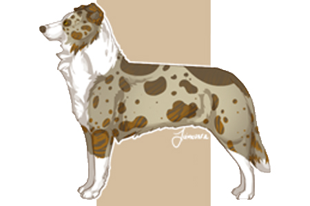 Ein reinerbig zobelfarbener Border Collie (Clear-Sable) bei aufgehellter brauner Grundfarbe mit Merlegen. Gencode: bb/kyky/dd/AYAY/Mm/E- Offizielle Bezeichnung: Lilac-Sable-Merle / Lilac-Zobel-Merle-Weiß |