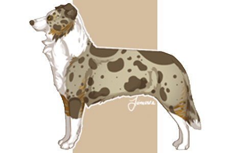 Ein mischerbig zobelfarbener Border Collie (Shaded-Sable) bei aufgehellter brauner Grundfarbe mit Merlegen Gencode: bb/kyky/dd/AYaW/Mm/E- oder bb/kyky/dd/AYat/Mm/E- Offizielle Bezeichnung: Lilac-Zobel-Merle-Weiß / Lilac-Sable-Merle |