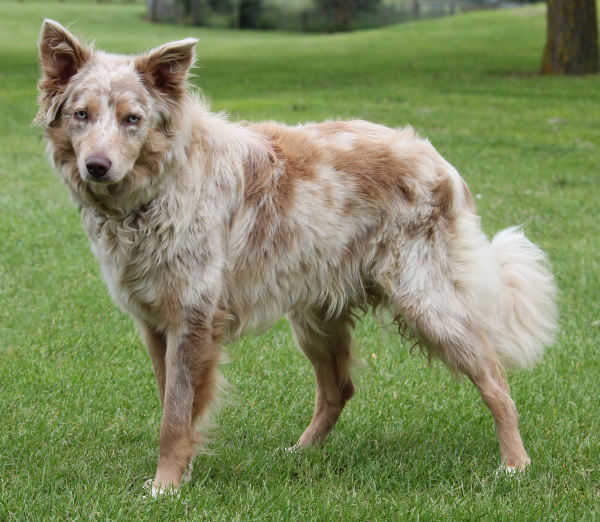 Ein mischerbig wildzobelfarbener Border Collie bei aufgehellter brauner Grundfarbe mit Merlegen Gencode: bb/kyky/dd/aWat/Mm/E- Offizielle Bezeichnung: Lilac-Merle-Shaded-Wolfsable / Lilac-Merle-Shaded-Wolfsable-White |