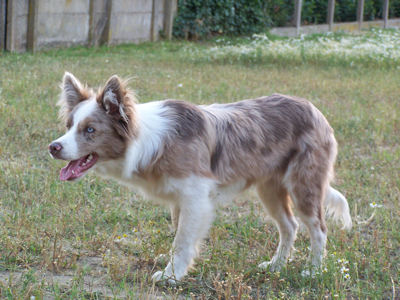 Ein reinerbig wildzobelfarbener Border Collie mit Merlegen bei aufgehellter brauner Grundfarbe Gencode: bb/kyky/dd/aWaW/Mm/E- Offizielle Bezeichnung: Lilac-Wildsable-Merle / Lilac-Wildsable-Merle-White |