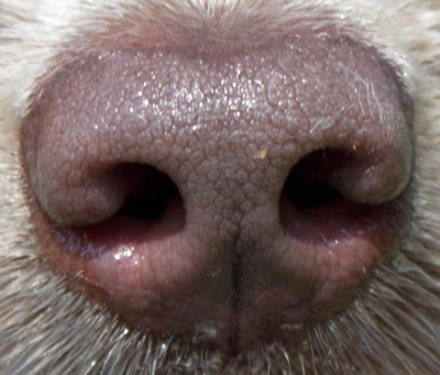 Bei einem aufgehellt braunen Hunden sind Nase und Lied immer beige-grau. |